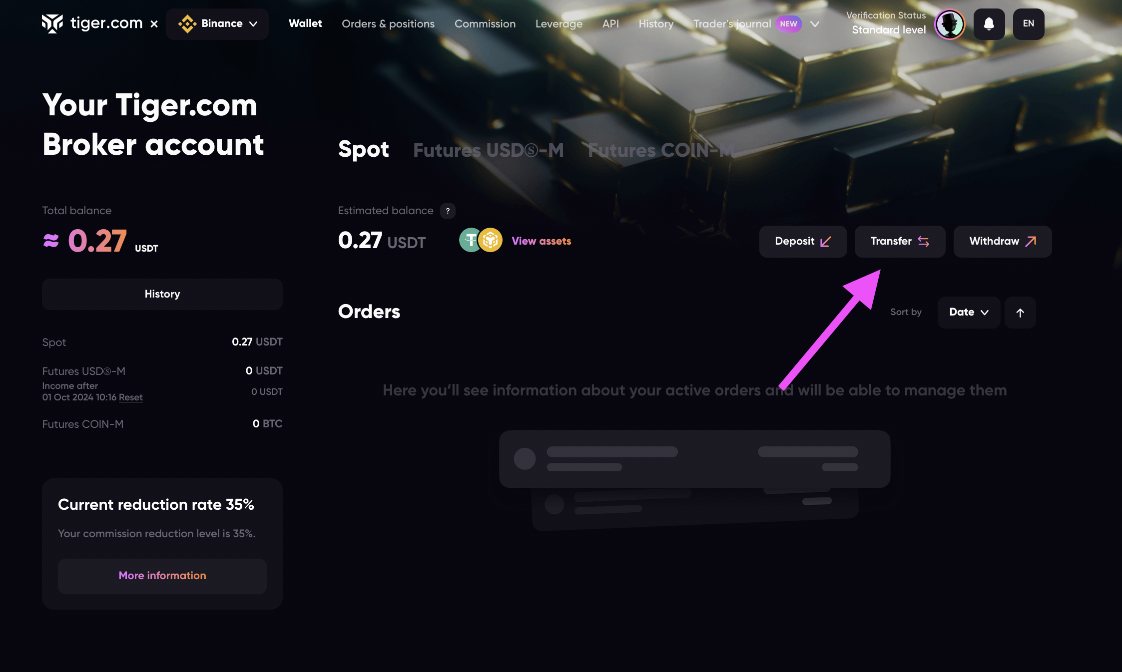 1. &#x20;Go to the [Wallet](https://account.tiger.com/wallet) and click the **Transfer** button: