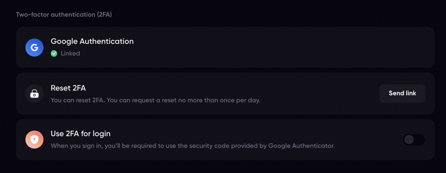 <figure><img src="https://3857619824-files.gitbook.io/~/files/v0/b/gitbook-x-prod.appspot.com/o/spaces%2Fyw4jlbyXBiRSgCIsu0tg%2Fuploads%2FpfiuI6awDJ7hUYsadWZ3%2FScreen%20Shot%202024-12-06%20at%2013.11.33.png?alt=media&#x26;token=1ddc85c7-9b05-411e-934a-5d4c1dc30f1c" alt=""><figcaption><p>2FA settings in Profile Menu</p></figcaption></figure>