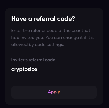 This widget indicates which referral code your account is currently linked to. You can change it yourself if the code's settings allow. To do this, simply replace the current code with the desired one and click "Apply."