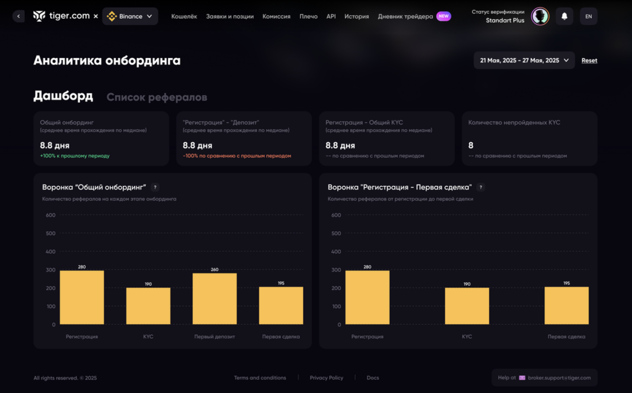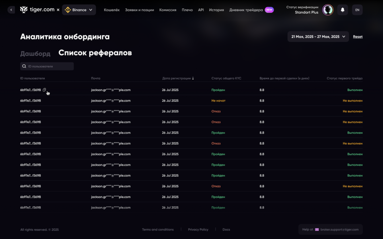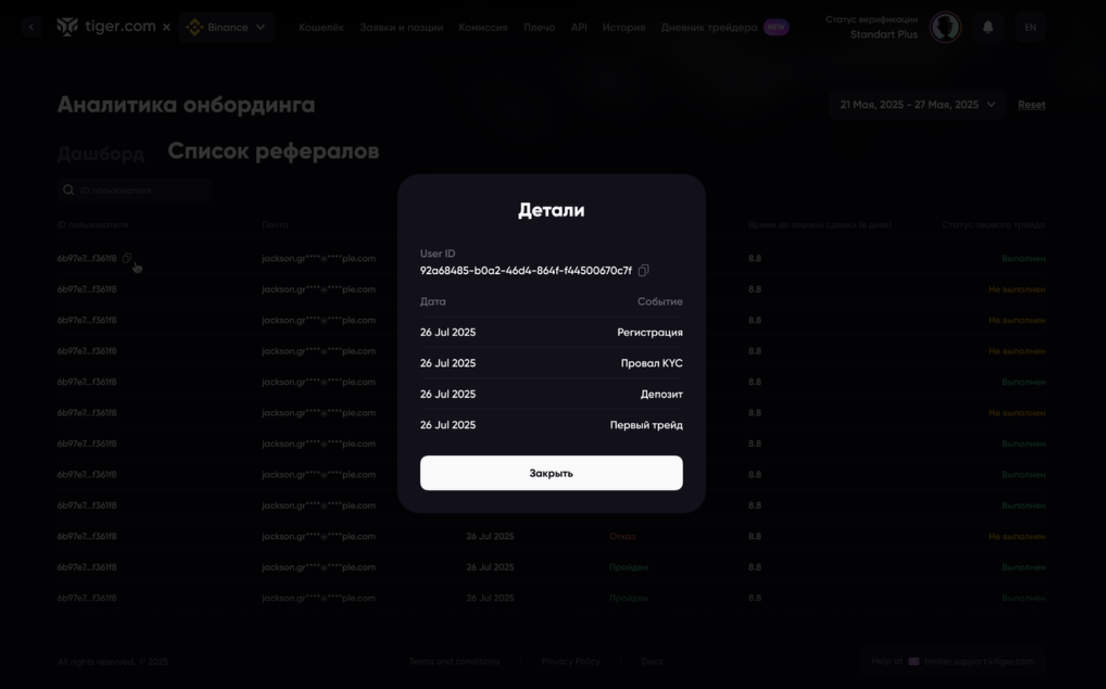 🔍 Отслеживать путь рефералов — от регистрации до первой сделки.