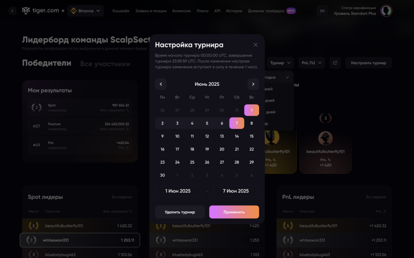 Менеджеры команд могут запускать турниры с кастомными датами прямо на странице лидерборда. Это позволяет сфокусироваться на конкретном периоде и анализировать результаты участников в рамках заданного интервала.