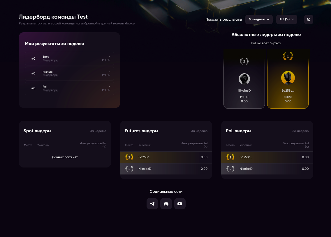 * **PnL-лидеры** — место в рейтинге и чистая прибыль.